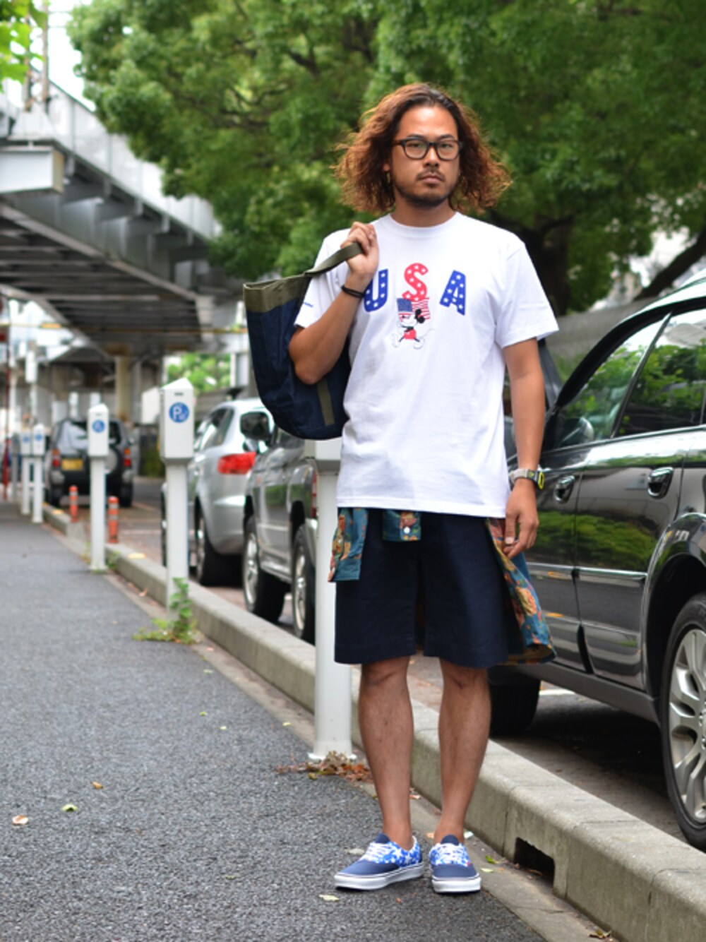 model : A-toy 今回は【Disney】MARCHING TEEを中心にコーディネート。 どこか懐かしさを感じる「OLD GLORY」テイストのポップなUSAロゴをバックに、アメリカ国旗を掲げて楽しげに行進する「ミッキーマウス」が印象的なクラシック・デザインでこちらは現在予約受付中ですので是非。 Tee : Lafayette / 【Disney】MARCHING TEE / SIZE M Shirt : LIBERTE BELL - FLORAL PRINT B.D. SHIRT Pants : LIBERTE BELL - CLASSIC BERMUDA SHORT Bag : LIBERTE BELL - RUGGED TOTE BAG Shoes : VANS 夜はまだ肌寒いのでさらっと羽織れる長袖シャツ。 ちょっとアツいときには今回の感じで腰に巻いてスタイリングのアクセントになる柄シャツもオススメです。 http://zozo.jp/brand/lafayette/ http://www.lafayettecrew.com/