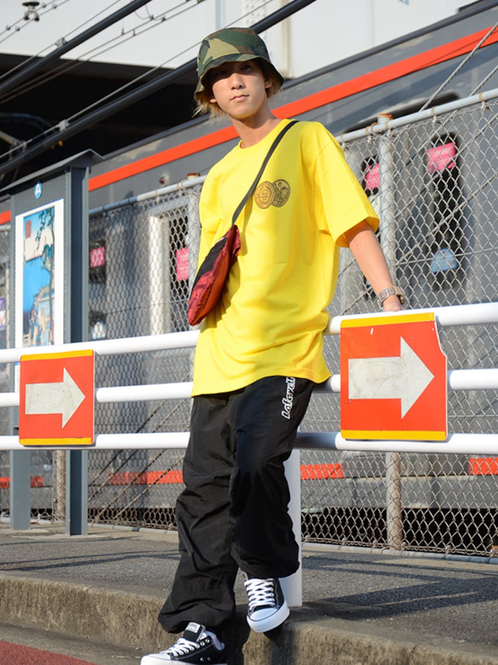 Model : MITSUKI (172cm) ■HEADGEAR Size-L/XL ROTHCO BUCKET HAT 55502 WOODLAND CAMO ■TOPS Size-L Lafayette B.I.G. MEDAL TEE LFT18AW005 YELLOW ■BOTTOMS Size-XL Lafayette OUTLINE LOGO CLASSIC NYLON PANTS LFT18AWSP005 BLACK ■KICKS Converse CTAS PRO OX 144578C BLACK ■BAG Lafayette RIPSTOP NYLON MULTI SACOCHE LFT18AW010 BURGUNDY