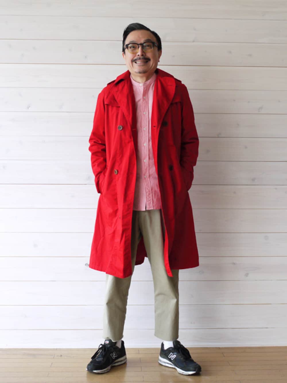 この真っ赤なトレンチコートは、洗い加工によるパッカリングの、いいヌケ感のせいか、思ったよりコーディネートしやすいんです。 インナーには、クラシックなテイストの、ピンクのオックスフォードのバンドカラーシャツでスタイリングしました。