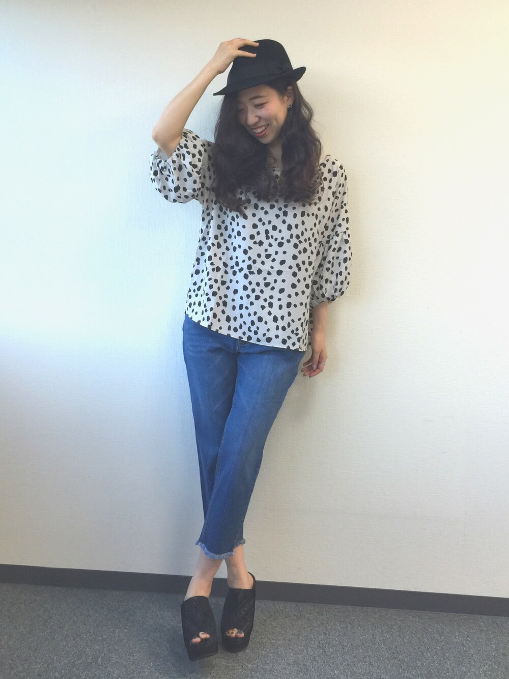 ダルメシアン柄トップスとデニムで 大人カジュアル♩♩ トップスのお袖と、 デニムの履きやすさがイチオシ!