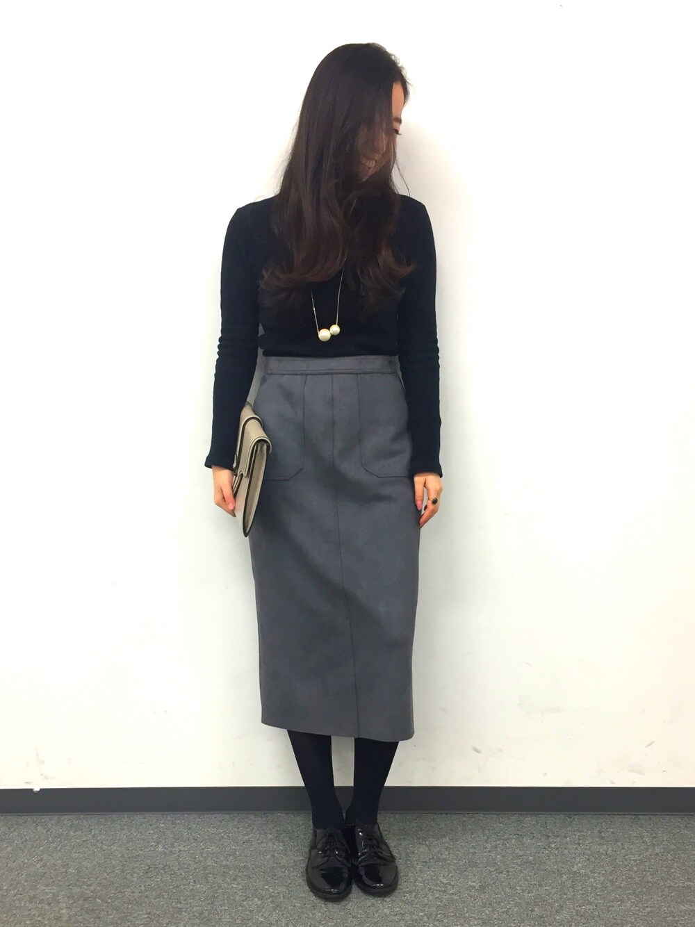 クリスマスや忘年会でイベントが多い今月のコーデ。 全体をシックにまとめた♪ ストレッチが効いているこのスカートはスタイリングの主役に☆