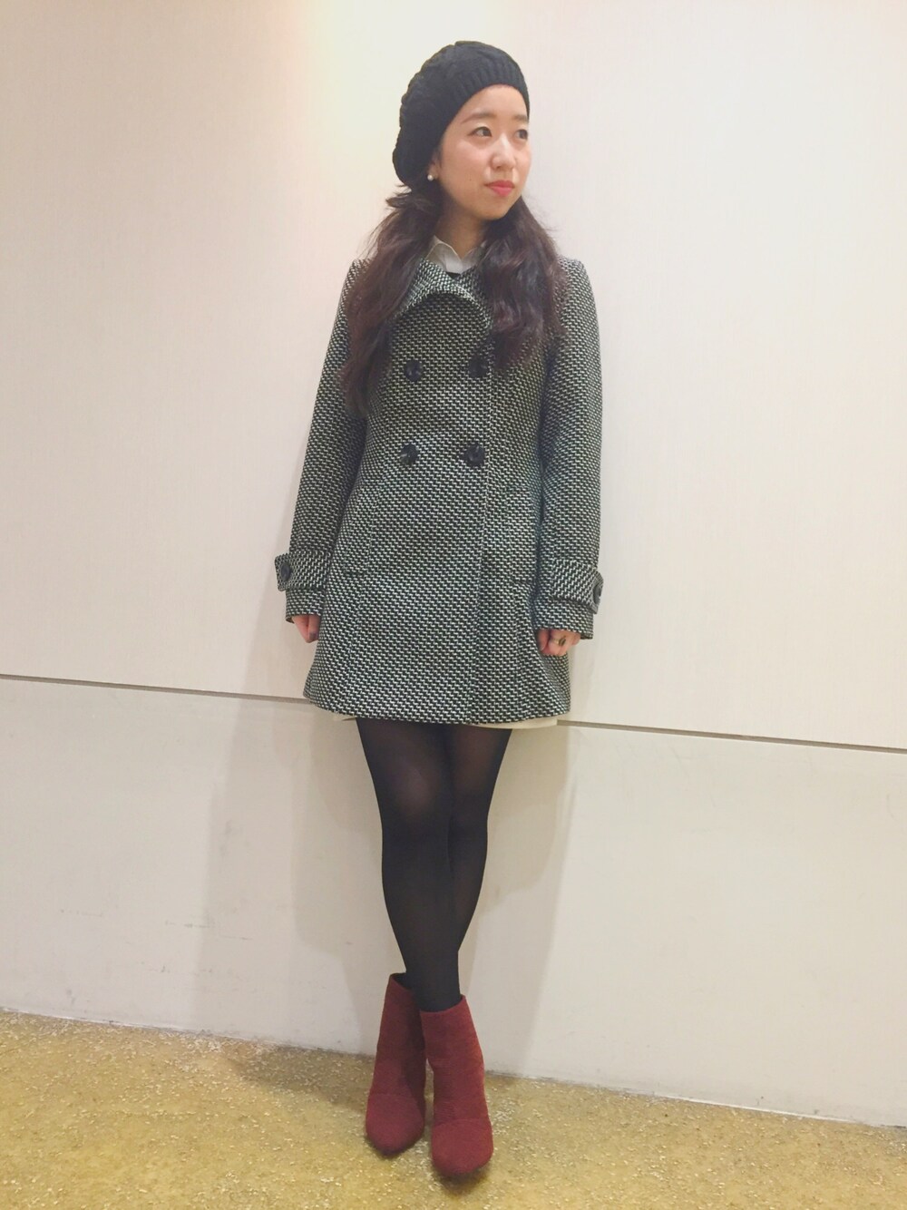 ツイード調コートに ベレー帽をプラスしてすこしレトロに! レッドのブーツがポイントです🎵 たまにはミニマルな感じも良いですね◎◎
