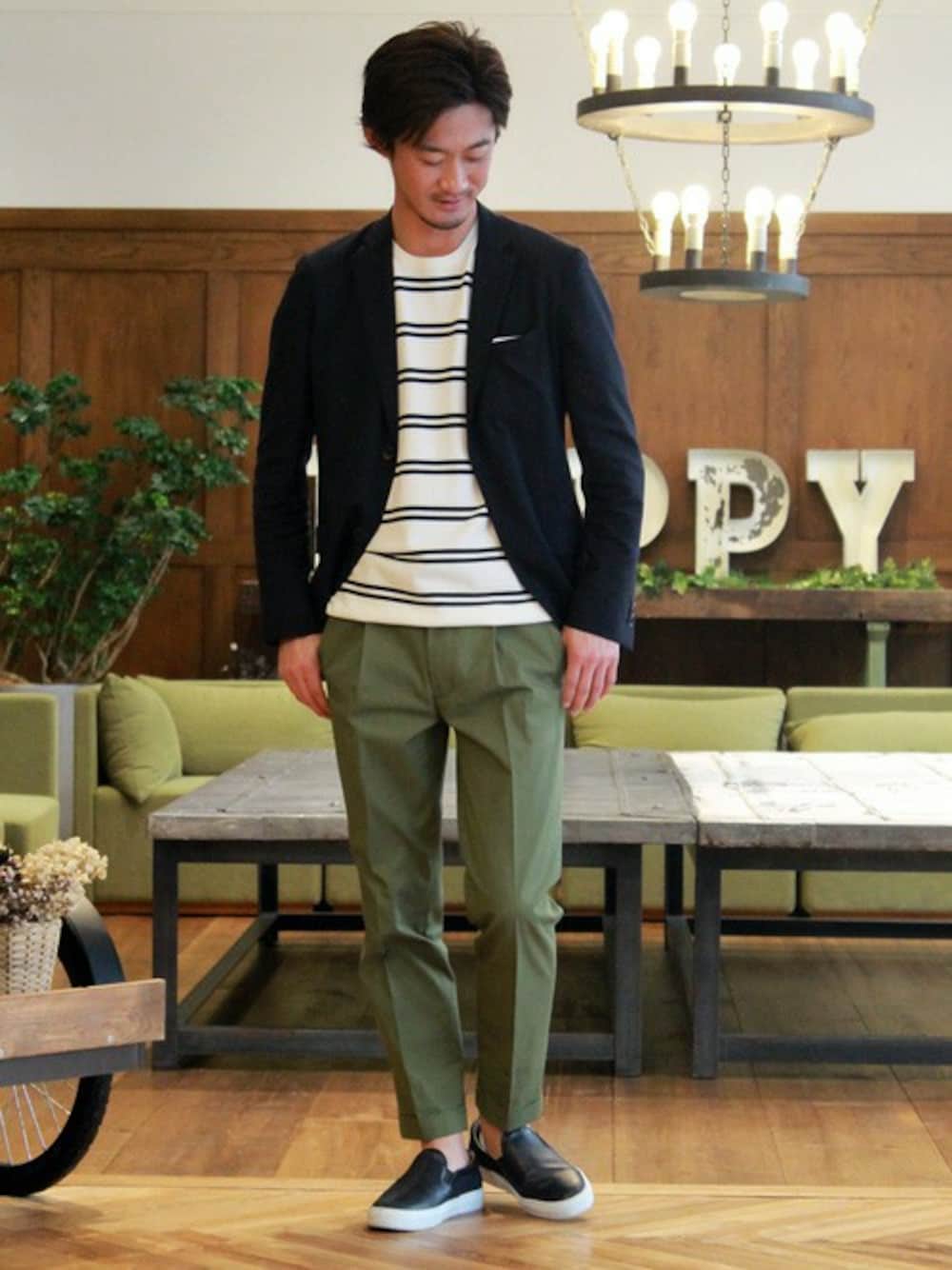休日でもジャケットをチョイス。 インナーにニットTシャツを着ました。 硬くなりすぎずカジュアルに羽織れるジャケットは休日におすすめ。 靴はスリッポンではずしてみました。