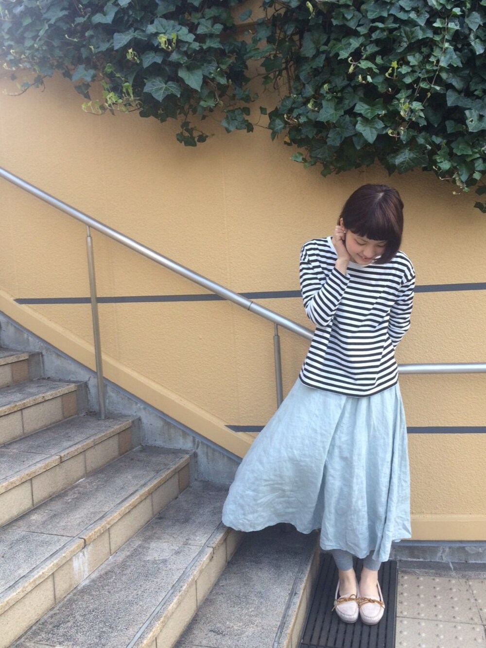 淡いブルーのスカートに、グレーのレギンスとCANVAS MOCのNaturalを合わせました。 Naturalは春色のお洋服に合わせやすく、1足あると便利です。