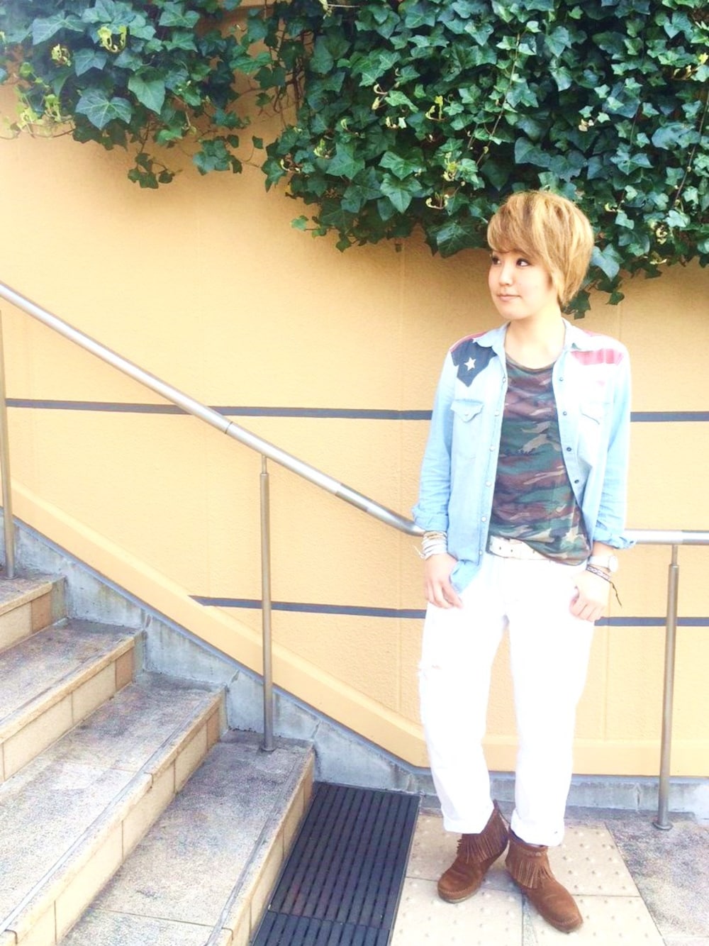 ミネトンカ代表作であるバックジップブーツで 迷彩×デニムシャツのアメカジ鉄板スタイル!
