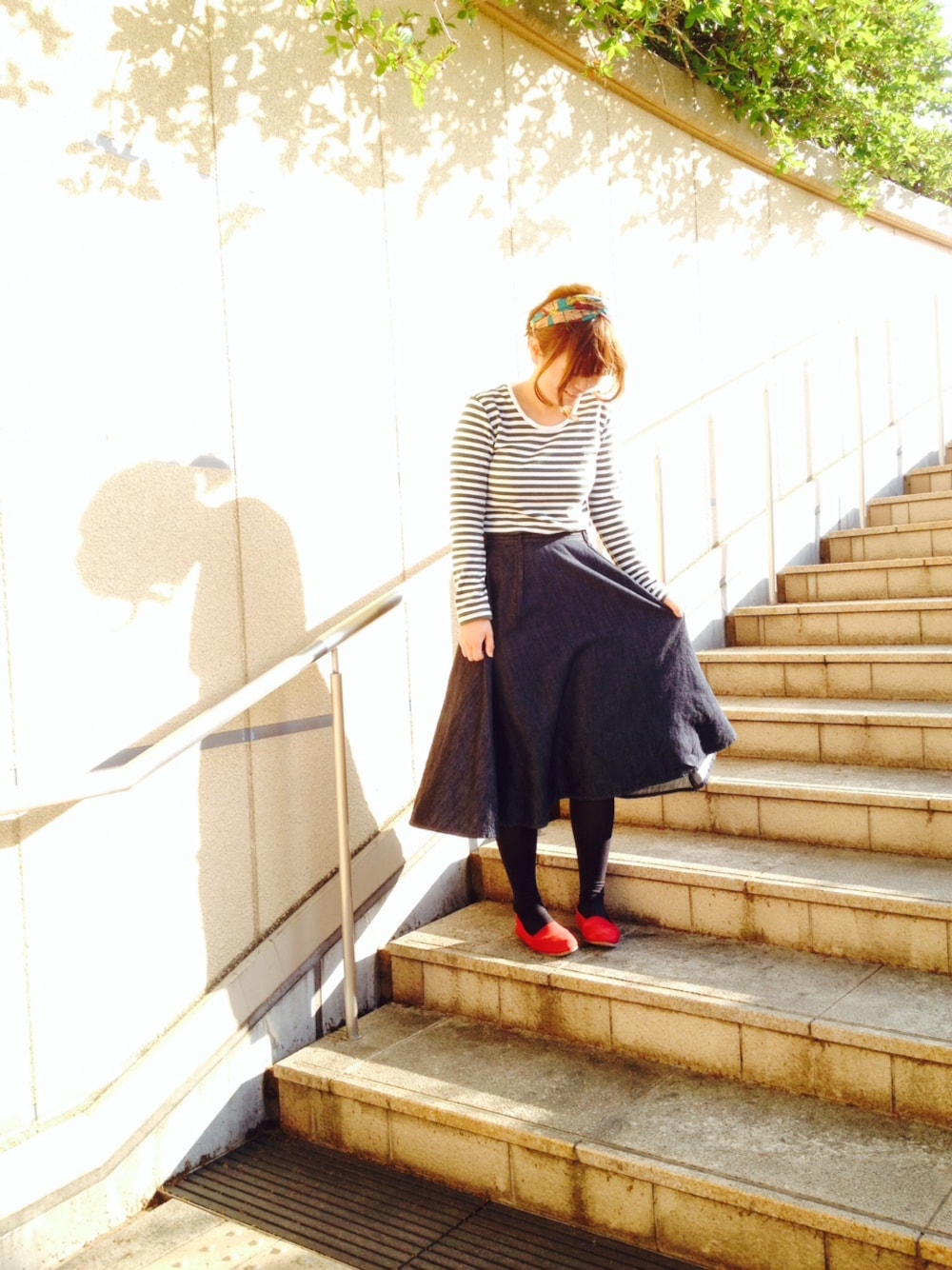 ハイウエストスカート + 細身のデザインのEVAは縦ラインが強調され、全体的にすっきりとした印象になります。 ボーダートップスを合わせて、マリンスタイルにすることで可愛らしさをプラスました。