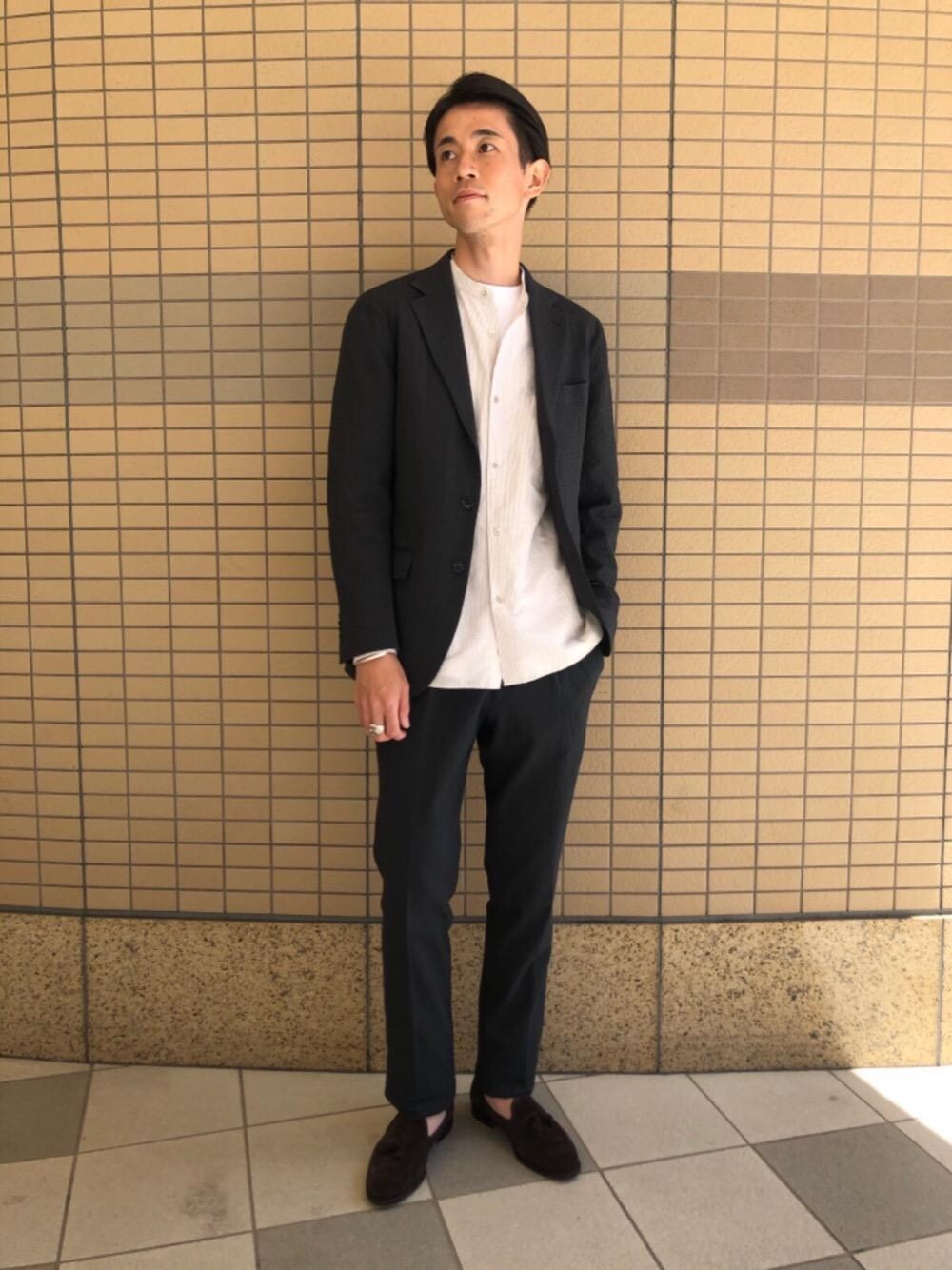 表情が特徴的なシアサッカーの素材を使用したセットアップです。 サラッとした素材感もありながら、ストレッチ性にも富んでおり、暖かい時期でも気持ち良く着用頂けます。 今回はコットンリネン素材のバンドカラーシャツを合わせ、肩の力を抜いた清涼感のあるコーディネートを意識しました。