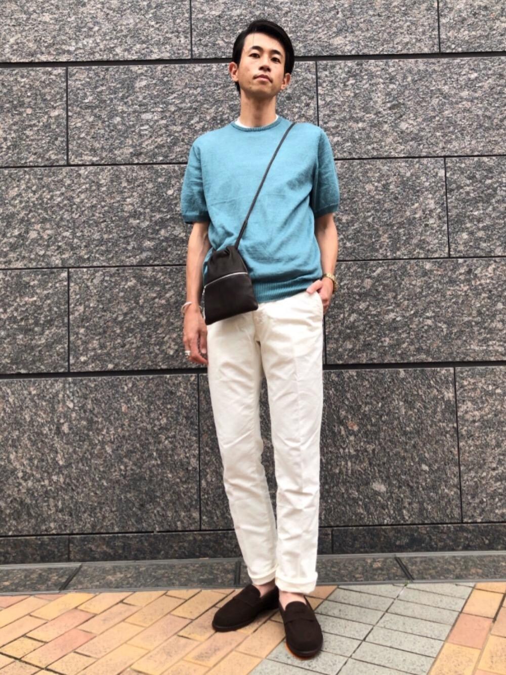 【身長】186cm 【普段のサイズ】LまたはXL 【素材感】 トップス:柔らかく、透け感と光沢感のある素材です。 ボトムス:伸縮性があり、動きやすい素材です。 【サイズ感】 トップス:標準 ボトムス:タイト 【着心地】 トップス:薄手で、肌あたりもサラッとしており、軽快な着用感です。 ボトムス:タイトなシルエットではありますが、伸縮性に富んでいる為、ストレス無く着用頂けます。 【コーディネートポイント】 色鮮やかなコバルトブルーのニットは、ホワイトのボトムスと合わせることで、清涼感が引き立ちます。ブラウンの革小物をアクセントに、爽やかな中にも、シックで品のあるコーディネートを意識しました。