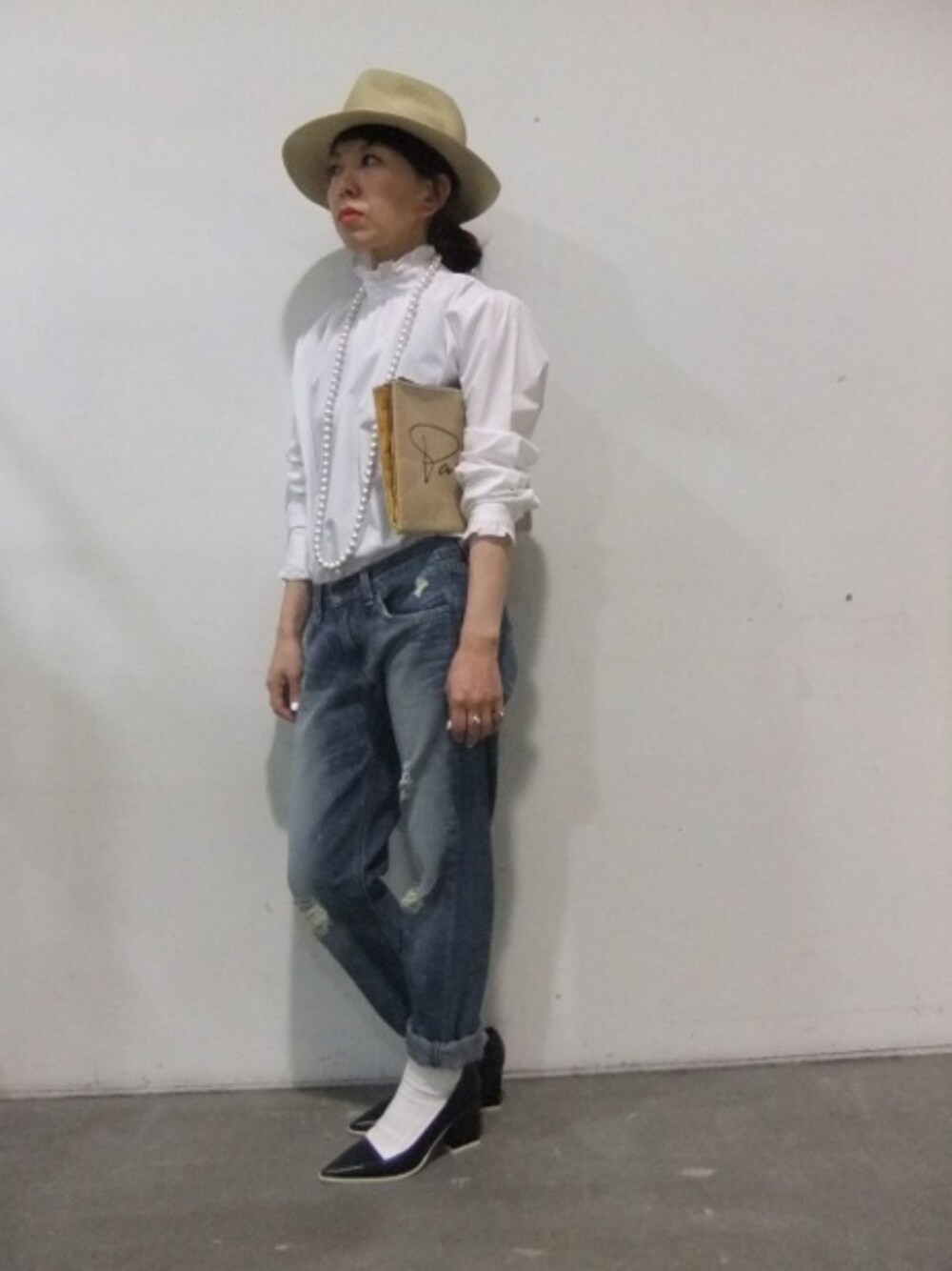 シャツで丁度良い季節になりました✨ ハイネックのフリルシャツにはダメージデニムでカジュアルダウン 定番的なシャツ×デニムには小物で演出を。。。