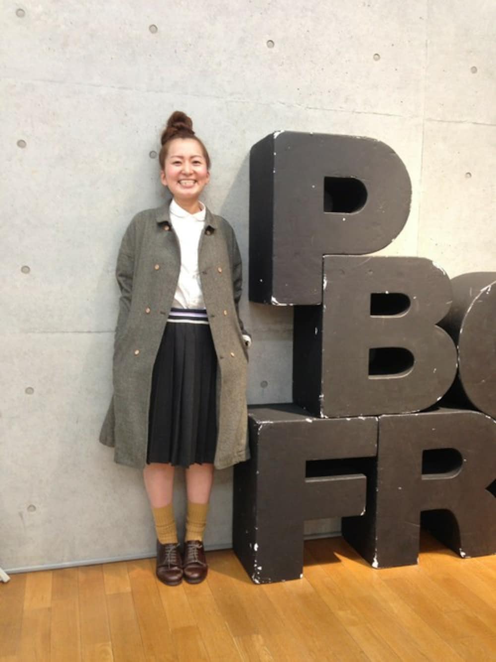 展示会で東京にきましたーーー!! たくさんお話を聞けて、話せて、 嬉しいな。 そして、 新作アイテムたっくさん見て、 わくわくしています。 フラボアの春物。 楽しみにしていてくださいねっ! 本日のコーディネートは、 大阪限定のアウター、『ウールサニー』に お気に入りのプリーツスカートを合わせました。 ウエストインがお勧めです◎