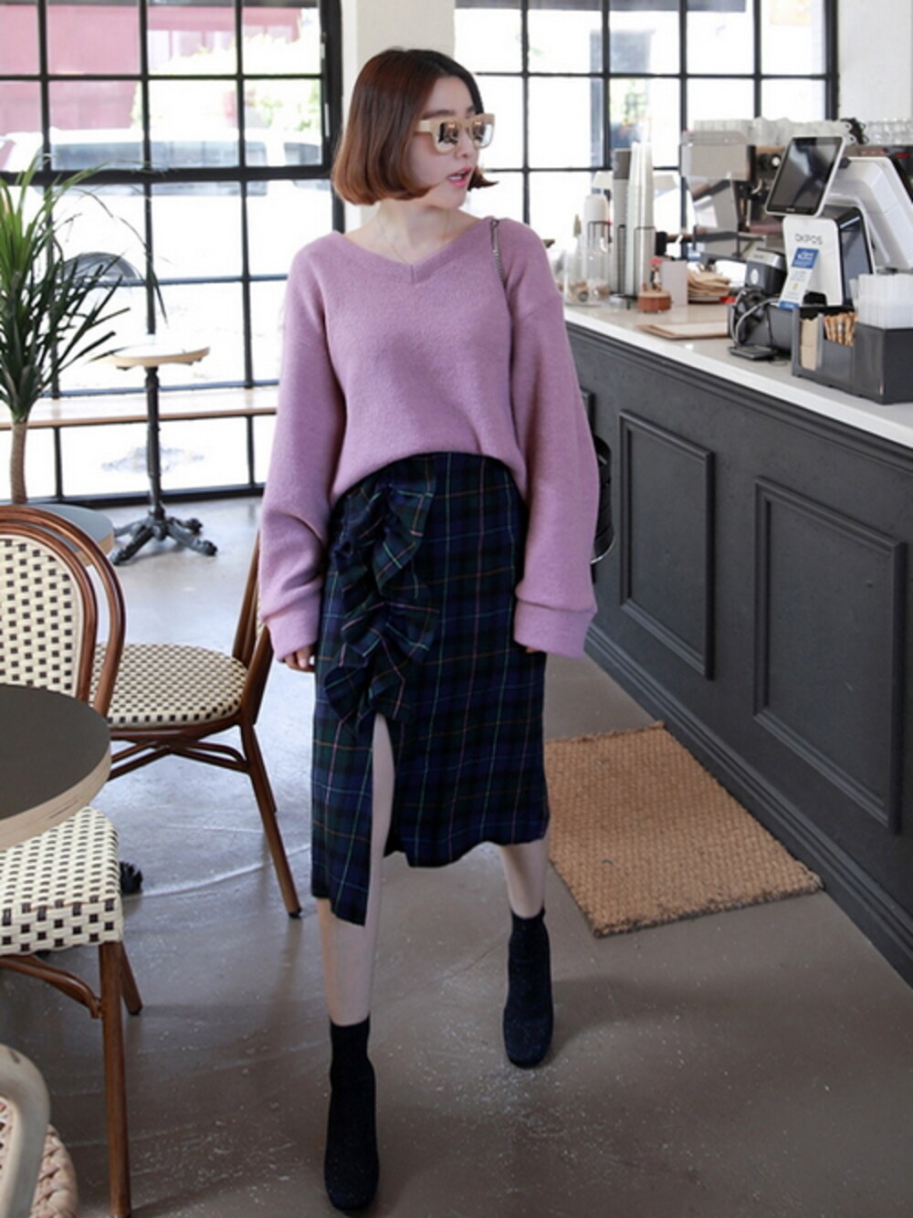 Miamasvinのその他「フリルポイントスリットチェックミモレスカート」を使ったコーディネート