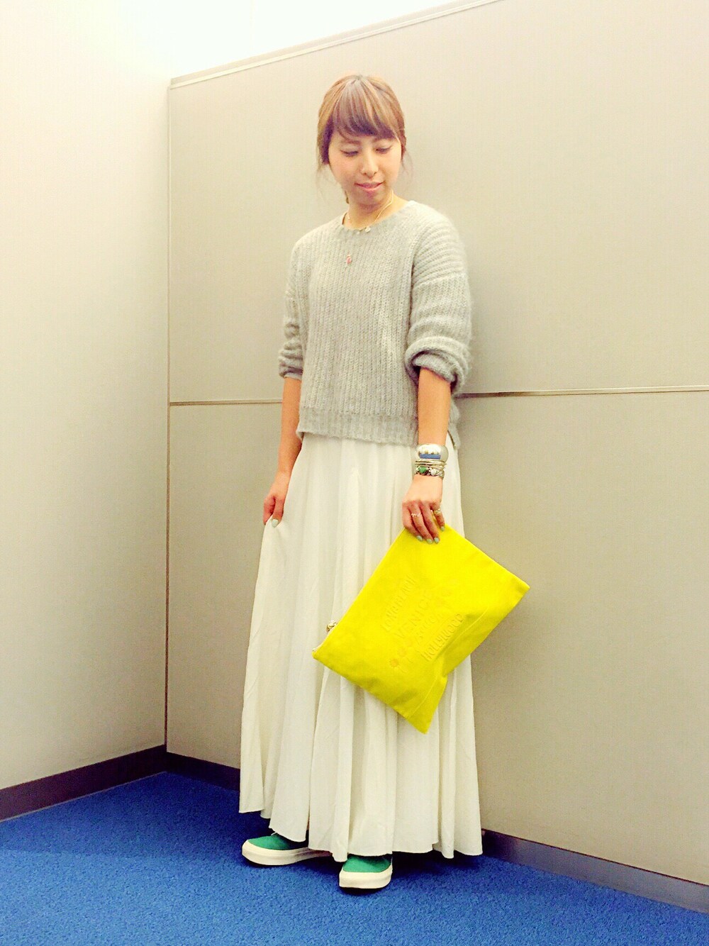 白のマキシでガーリーにコーディネートです🙊💕 スニーカーや バックで色を。 アクセは 胸元も 手首も重ね付けをして インパクトを出してます。 黄色のクラッチの 刺繍は 夏が楽しみになるような アメリカ西海岸の 地名とパームツリーが! でも なかなか写真では うまく写せませんでした…>_<