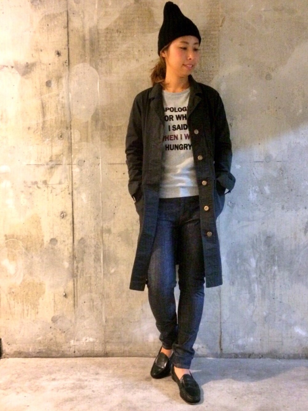 今日は ミリタリーツイルの ショップコートを メインに🌟 ブラックだとクールで カッコいいです。 ロングの羽織りは 今年何枚か持っていたい アイテムですね🎵