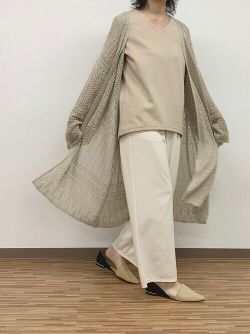 落ち着きのあるベージュで抜け感ある大人カジュアルスタイル。 肉感を拾わないゆったりとしたシルエットながらロングカーディガンを羽織ることで縦のラインを強調。 透かし編みにホワイトのパンツで夏らしく! しっかりとした生地を使用したカットソーでカジュアルになりすぎず、エフォートレスな印象に。