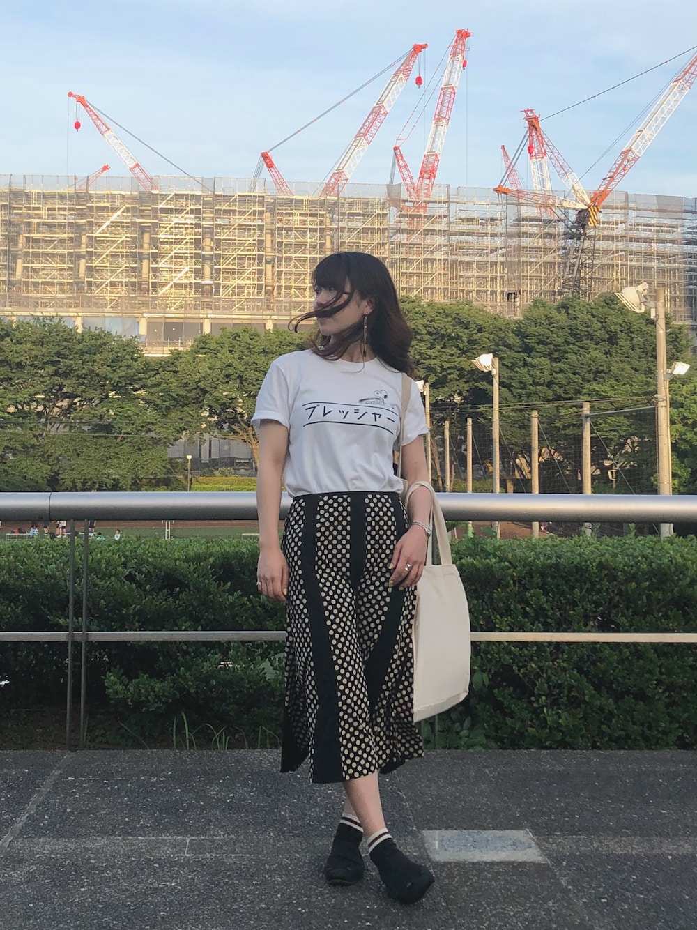 建設中の新国立競技場の前で📸 街行く人の視線を独り占めできる、 シュールなカタカナプリントがポイントです😊 ロゴにちょこんとスヌーピーが乗っている、 スヌーピー好きにはたまらないTシャツになっています😆❤️