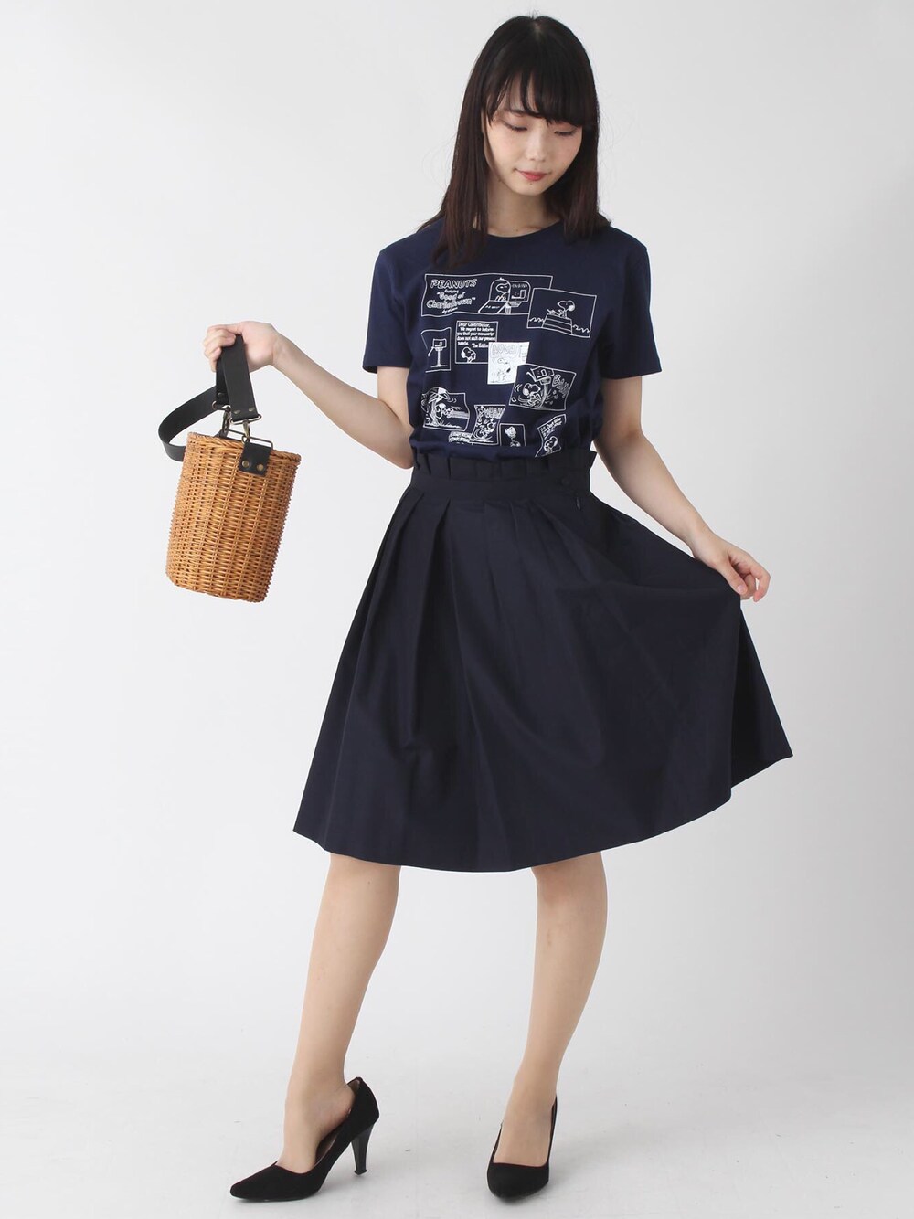 スヌーピーコラボTシャツ! コマが総柄風でかわいいです!😍 ハイウエストでスクール風なタックスカートもおすすめ!どんなトップスにも合わせやすいです!!