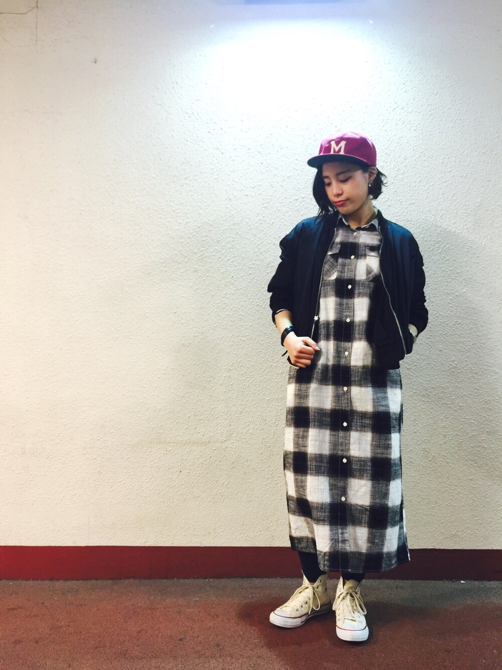 どーも! こんにちはー! 永留デース! 可愛いチェックシャツワンピ入荷したので早速着てみましたよ! マキシ丈大好きです。実は。 もう少し暖かくなったら羽織で着たいです。 気になる方は是非店頭まで! 因みに着用のMA-1は残りわずかになっておりますのでお早めに!