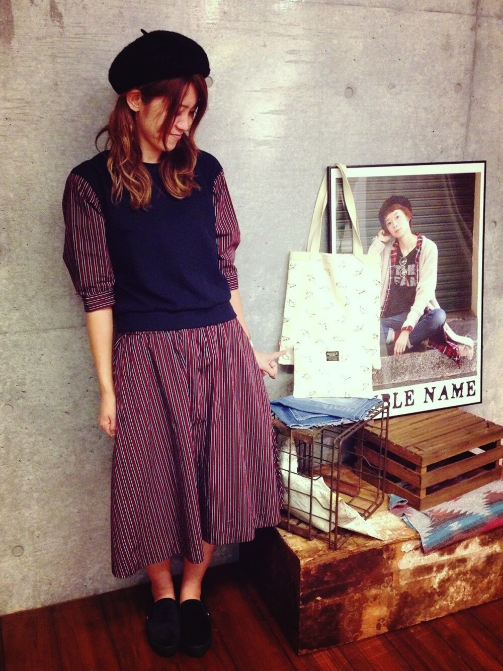 こんにちは! ノベルティがチラリ。指さしてます(笑) 12日からですよーー\(^o^)/ 入荷してスグ人気の2つのアイテム! セットアップで着ちゃいました^ ^ トップスは丈感すっきりで スカートでもパンツでも◎ スカートはリバーシブルで 裏が無地になっております! 色は着用のワイン、ネイビー、グリーン! 写真なくてすみません… 小倉マネージャーに撮って頂いて ニヤニヤした1枚で…(笑)