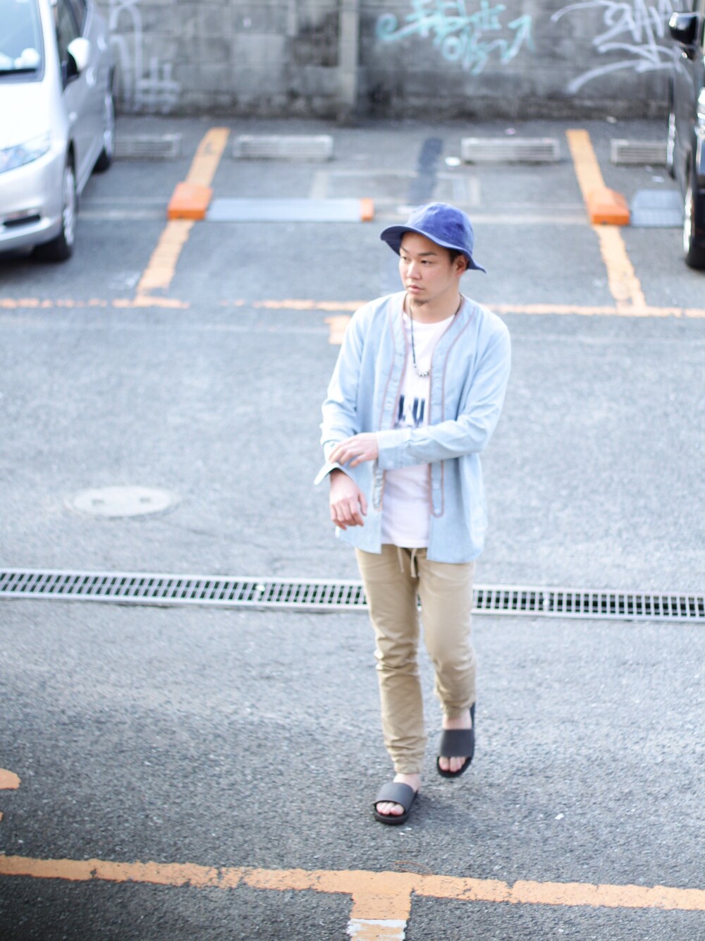 Hat : C-PLUS HEAD WEARS Shirt : Sandinista Tee : GABBA Pants : Sandinista Sandal : MANEBU Necklace : Sunset&Eagle