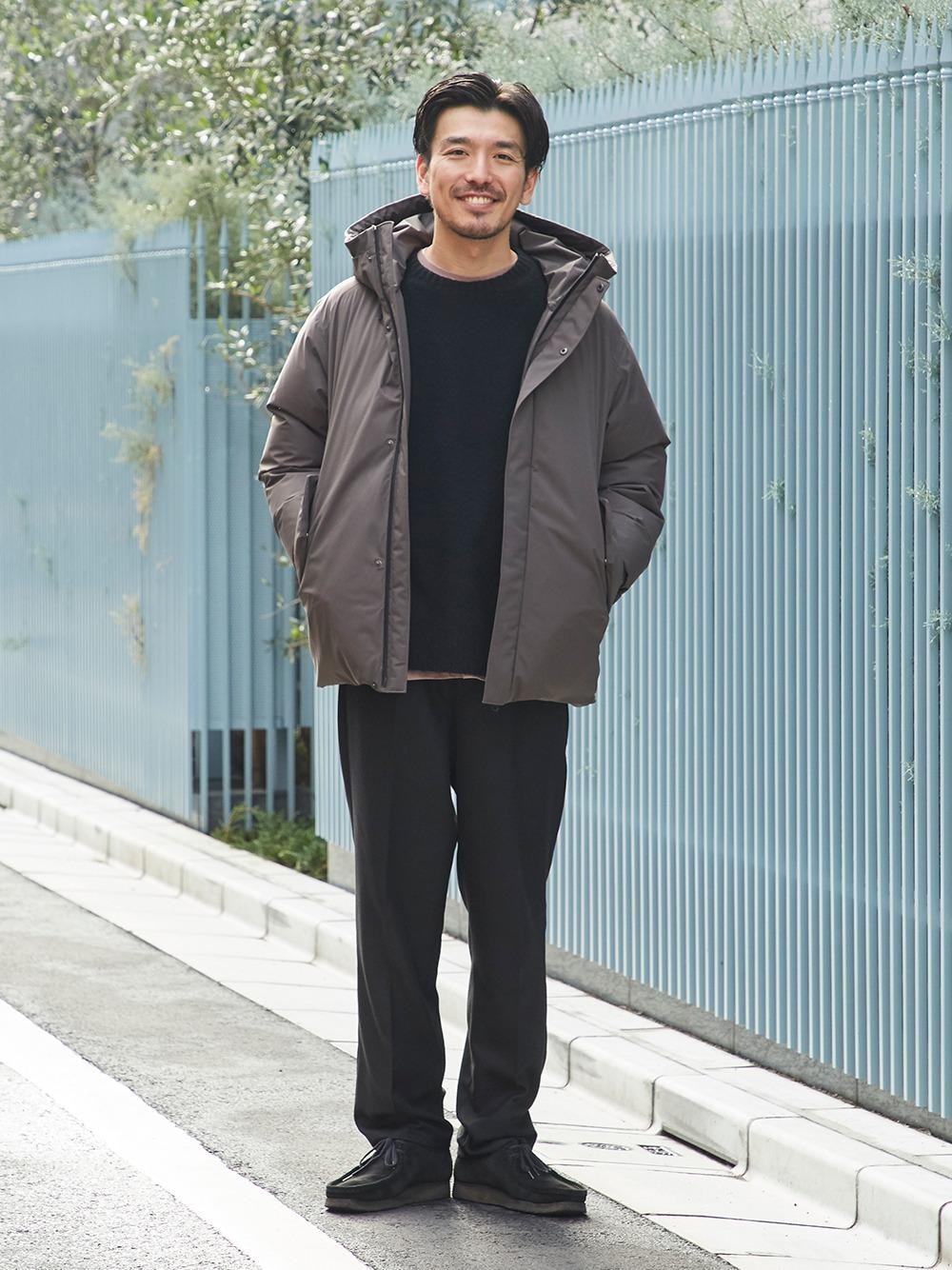 ユナイテッドアローズオリジナルのダウンジャケットは、900フィルパワーのダウンを使った、ドレッシーでありながらもボリューム感のあるシルエットが特徴。このダウンには、リラックスしたムードのニットやパンツが良く似合います。色と素材感の相性を意識しながら、クリーンな印象のコーディネートにしてみました。ちなみにこのダウン、外見はとてもシンプルですが、中はポケットなども充実していて使いやすいのも気に入っています。 ・ダウンジャケット<UNITED ARROWS>:¥52,000 + tax [1125-115-7331] ・ニット<UNITED ARROWS>:¥18,000 + tax [1113-106-4400] ・パンツ<Cellar Door>:¥17,000 + tax [1114-343-7243]