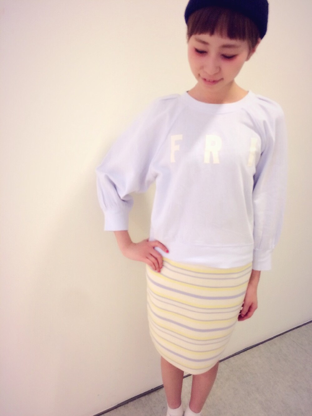 ゆったりシルエットのスウェットにパステルボーダーのスカートを合わせた春らしいスタイル♡