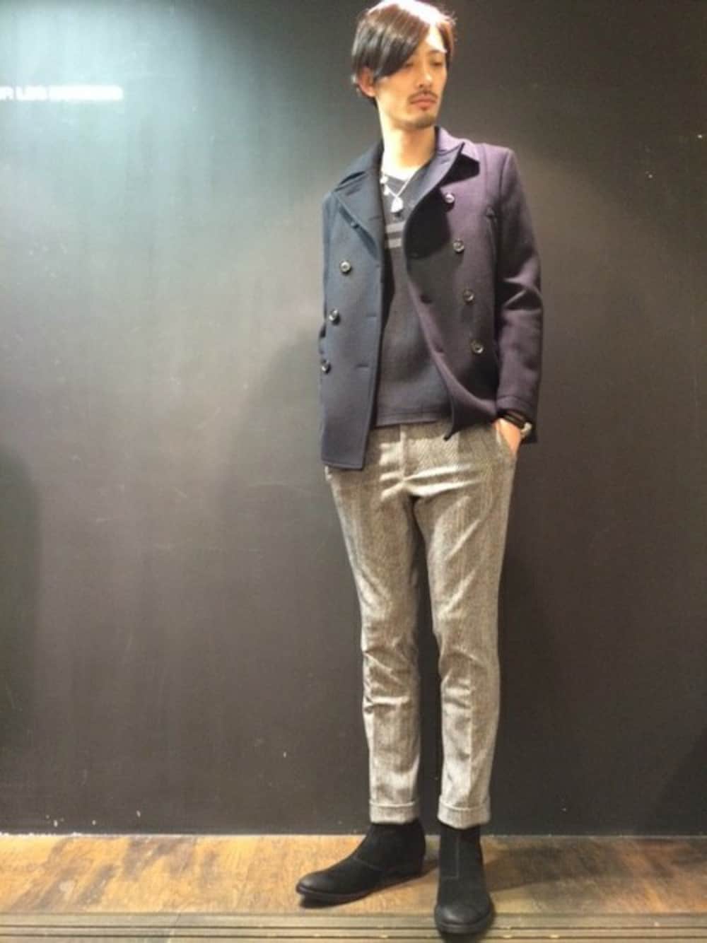 Pコートを使ったモノトーンコーディネートです。 インナーに挿しているラインストーンボーダーの カットソーが良いアクセントになっています。 パンツには細身のスラックスパンツで キレイ目にしています。