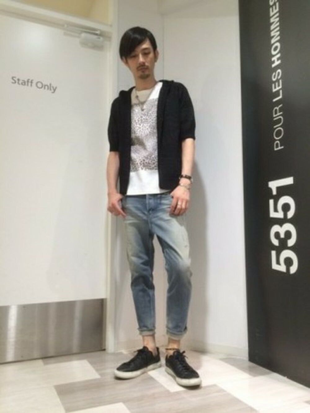 人気のBIGプリントTシャツを使用したコーディネート。 BIGシルエットですので、1枚で着て頂くのも良いですが 今回はざっくり編みのニットカーデとコーディネート。 パンツには薄めのブルーデニムを合わせ、清涼感を出しました。