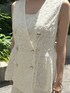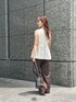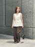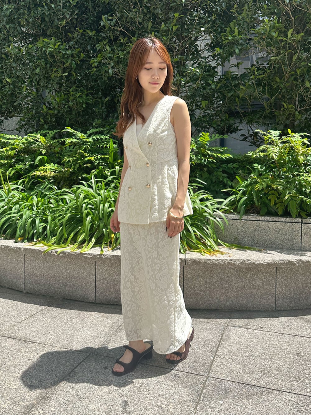 今の季節に映えるメッシュレースのジレは、同素材のスカートと合わせたセットアップ風コーデはもちろん、シーン別にボトムスを変えた着回しもおすすめです。トップスのペプラムシルエットが気になるウエスト周りをすっきりとさせ、パンツと合わせたコーデはオンスタイルにも着映えします。ヒールサンダルで軽さをプラスするのがポイントです。