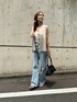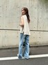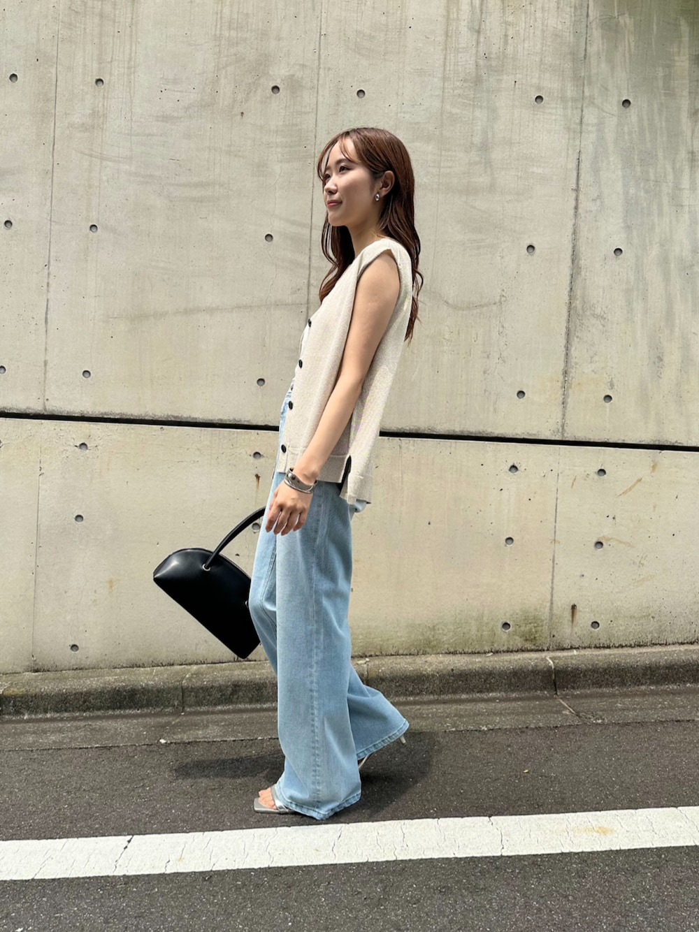 さりげないラメ感が可愛いベストは、釦をとめてプルオーバーとしては勿論、羽織りとしてタイリングすることで、よりリラックス感のある着こなしになります。ワイドデニムにはヒールサンダルを合わせ足元をすっきりとさせ、メリハリをつけるのがポイントです。