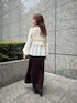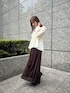 フロントのリボンデザインがポイントになり、一枚で着映えるおすすめのアイテムです。ブラウスは裾にかけてふわっと広がるペプラムシルエットのため、ボトムスはすっきりとしたナロースカートがおすすめ。ショートブーツを合わせてスタイルアップが叶う着こなしにしました。