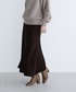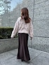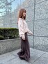 たぷっとした袖口が可愛いニットはすっきりとしたボトムスとの合わせがおすすめです。ストライプのシャツをレイヤードしたのもポイント。ピンクとダークブラウンでまとめて、程よい甘さを演出しました。