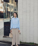 エンブロイダリーのレースの裾がポイントで一枚で着映えるおすすめのアイテムです。タック入りのパンツできれいめにまとめ、落ち着いた雰囲気に着こなしました。足元はシーンを問わず使えるローファーパンプスを合わせてスッキリとさせるのがポイントです