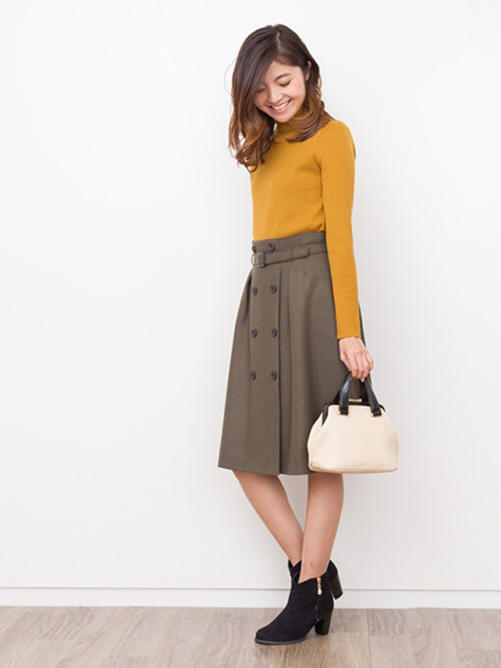 マスタード×カーキで大人カラーの通勤コーデ♪ ミニバッグが今年気分。