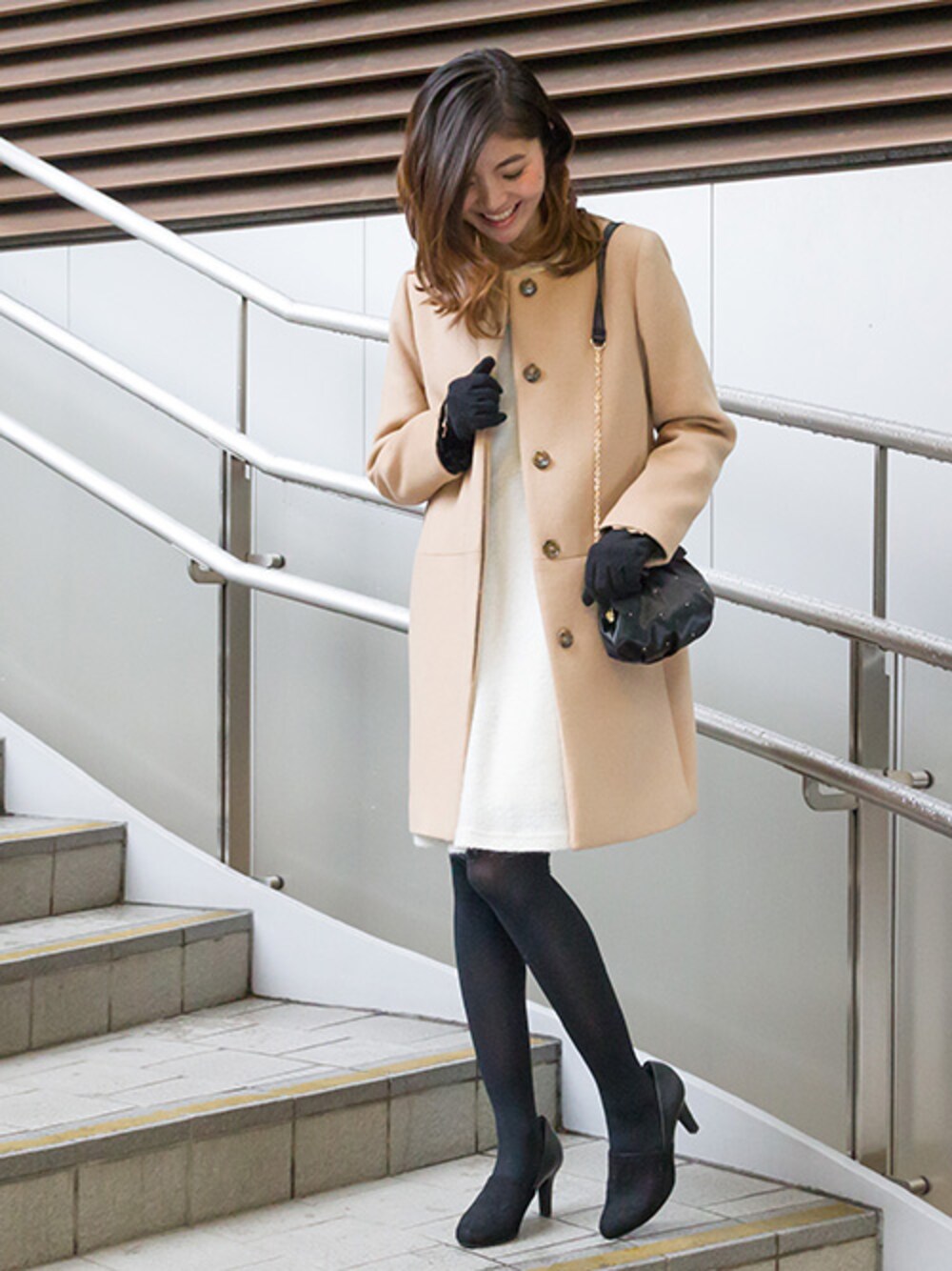 クリスマスはワンピースでお出かけ♪ 小物はブラックをチョイスしてコーディネートを引きしめます。