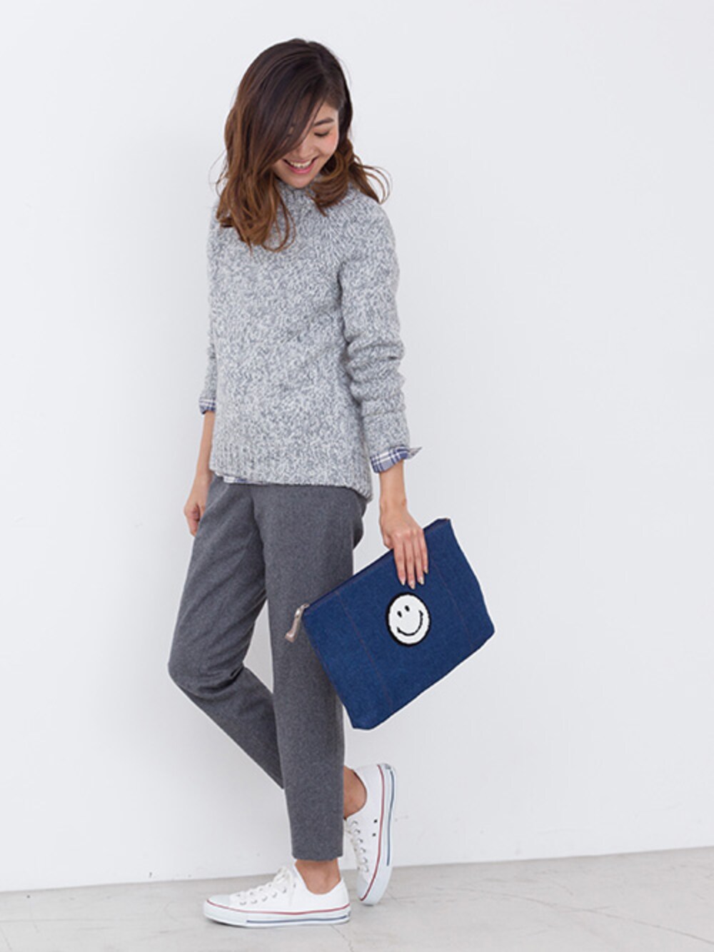 休日リラックスコーデ スマイルのクラッチバッグをあわせたらHappy気分♪