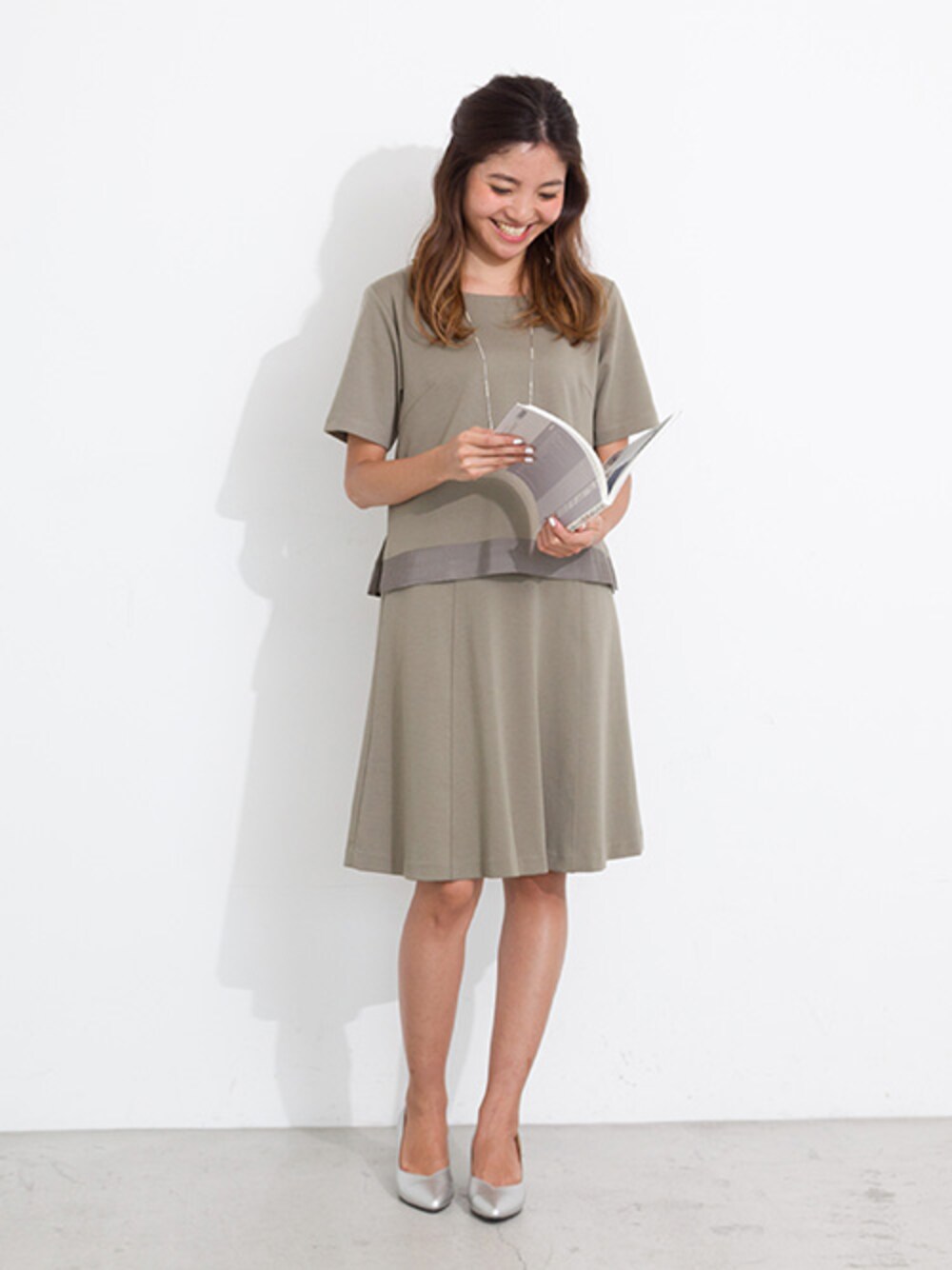 セットアップはカーキで大人っぽく。 シワになりにくいポンチ素材のセットアップは 通勤コーデにもお勧めです。