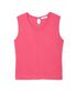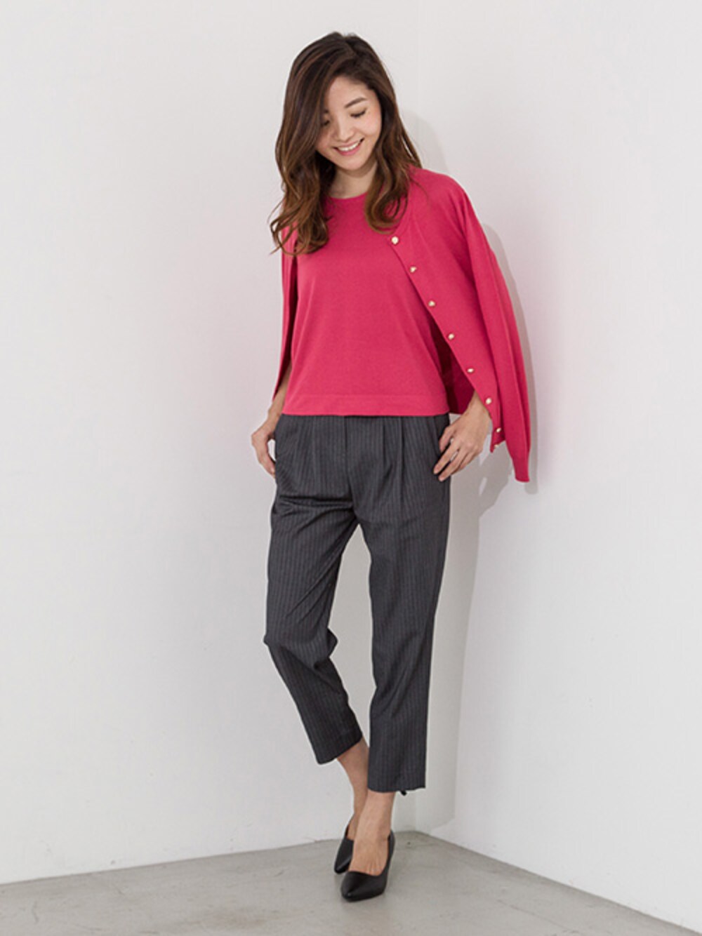 UV CUT機能つきのニットとカーディガンはフラワーボタンつきでシンプルながらキュートなアイテムに。目を引くピンクが印象的。