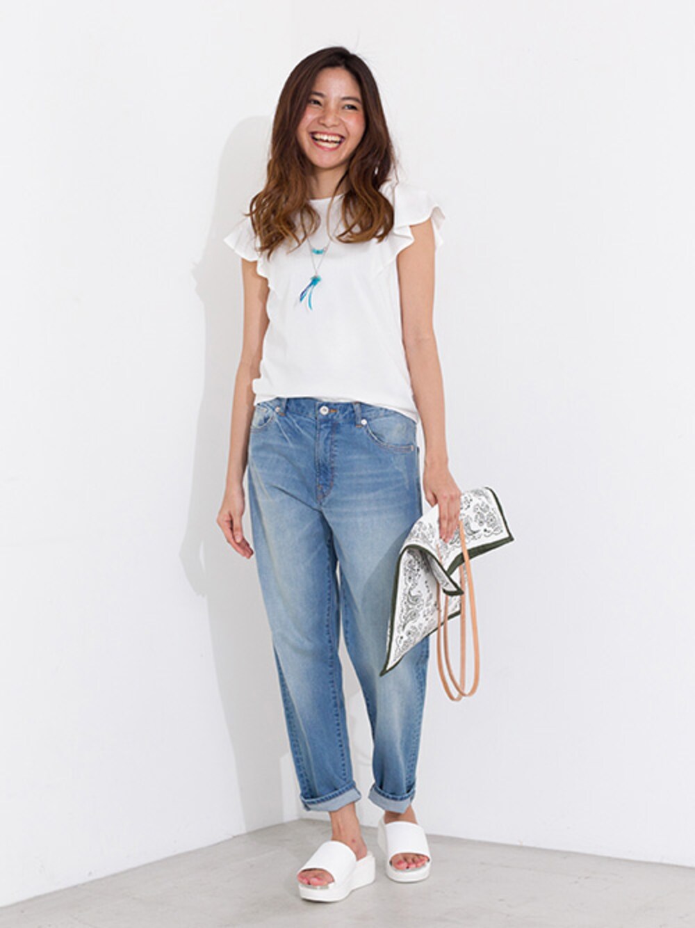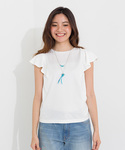 ラッフルスリーブがポイントのカットソーは、カジュアルなデニムスタイルも女性らしく仕上がります。