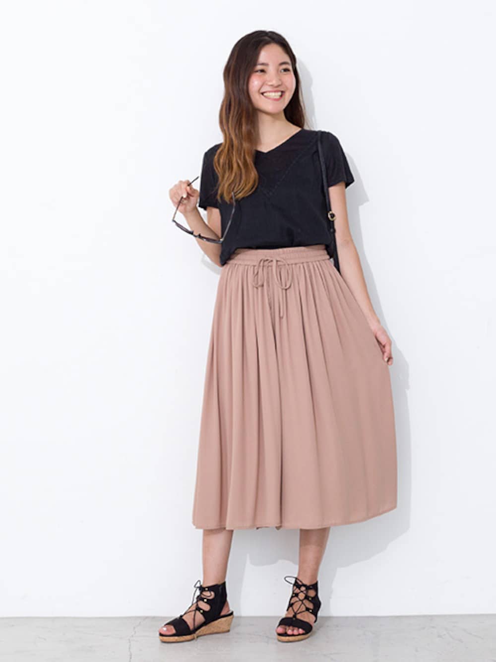 なめらかな風合いのギャザースカーチョなら カジュアルなTシャツ合わせもフェミニンに。