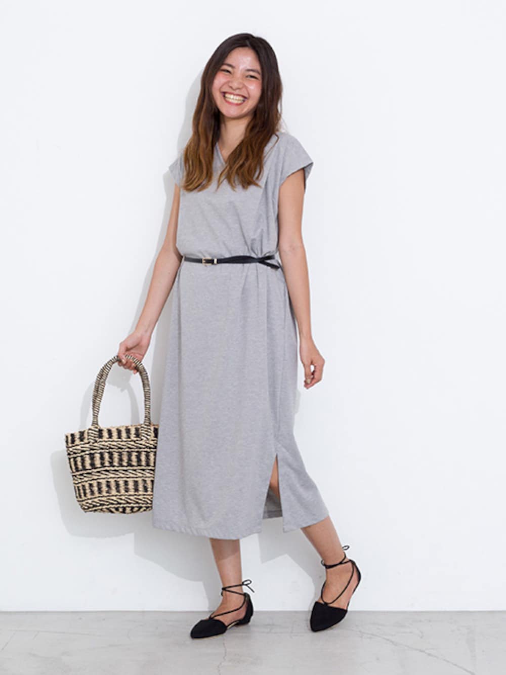 女性らしいIラインのスリットカットソーワンピース。 黒小物でまとめて大人っぽく。