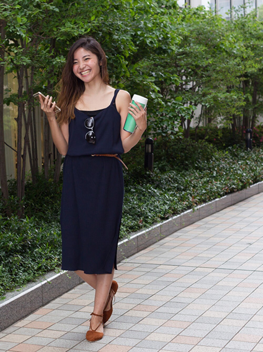 サイドスリットが女性らしいキャミワンピースの休日スタイル。