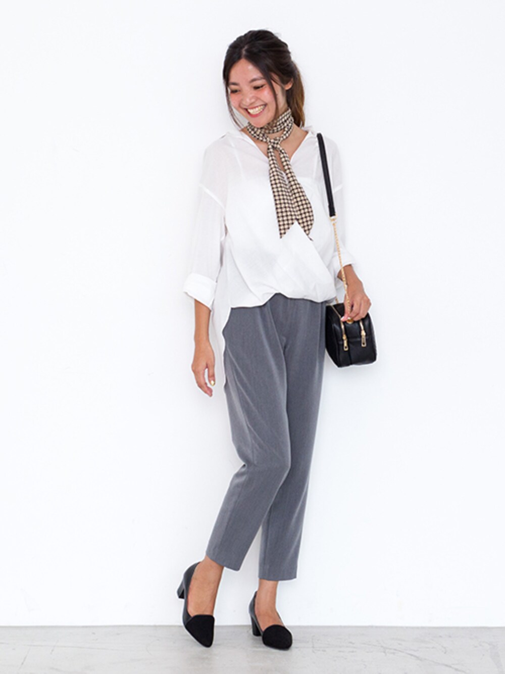 通勤コーデに欠かせない襟付きシャツ。 パンツスタイルなら首元にスカーフをプラスして女性らしく。