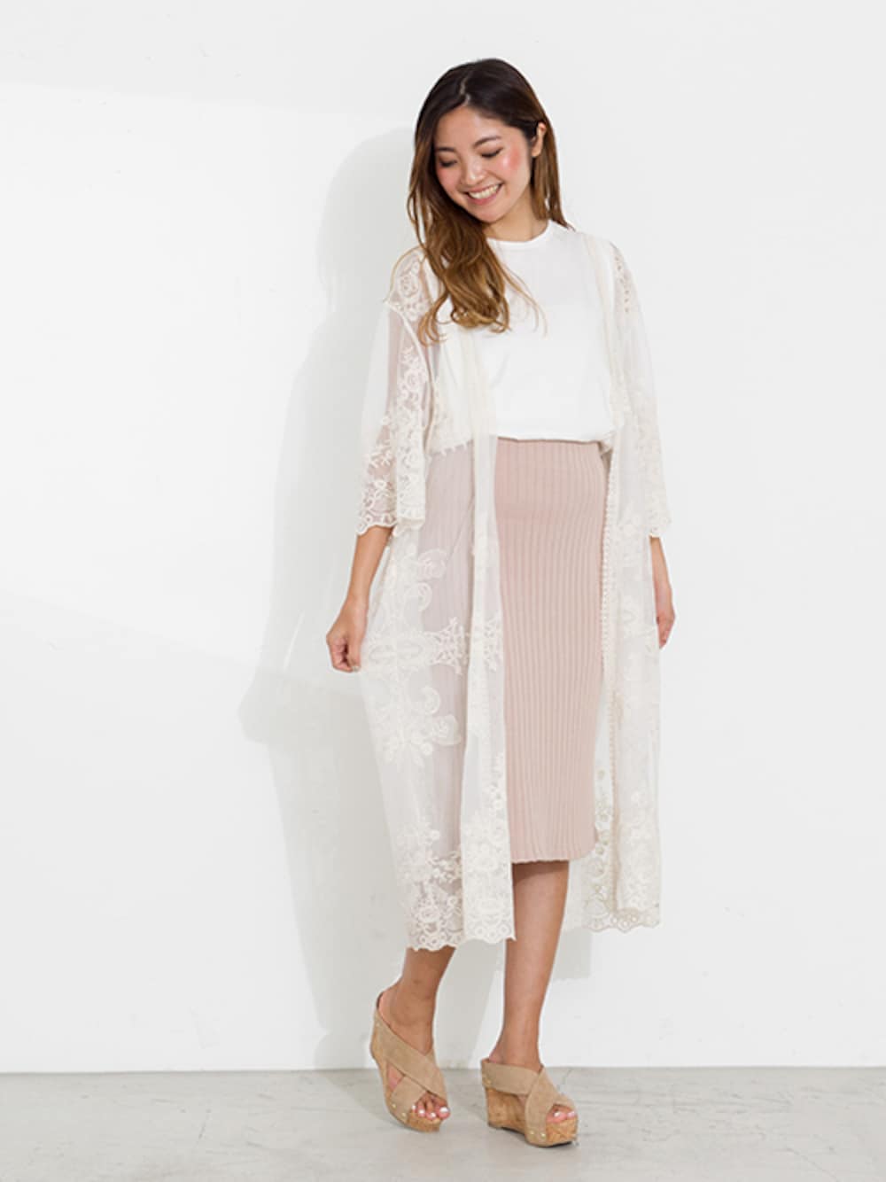 チュールレースのさらりと羽織れるロングガウン。トレンド色の強いアイテムでも、キレイ目にまとめればオフィスシーンにも取り入れられる1枚に。