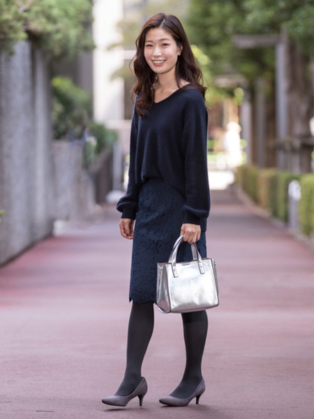 レースやふんわりニットと素材を選べばネイビーのワントーンコーデも真面目になりすぎず、オフィスで愛されるキチンと見えの優秀コーデに。