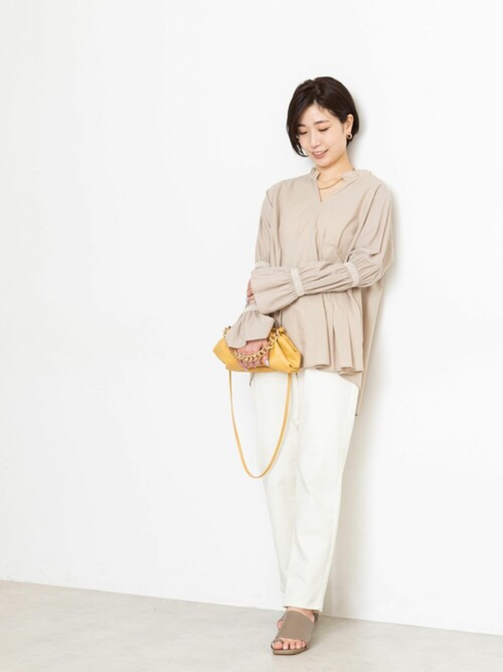 この春はスモッキング刺繍のデザインが気になります♪ニュアンス感のあるベージュなら、オフホワイトの刺繍でカジュアルになりすぎず、ふんわりとしたチュニックシルエットなので、大人の方でも取り入れやすいブラウスです。袖は軽くまくって程よいボリュームをだすのがおすすめの着こなし。ホワイトデニムをあわせて、きれいめカジュアルなコーディネートに。環境に配慮したオーガニックコットンを使用しているのもおすすめポイントです。