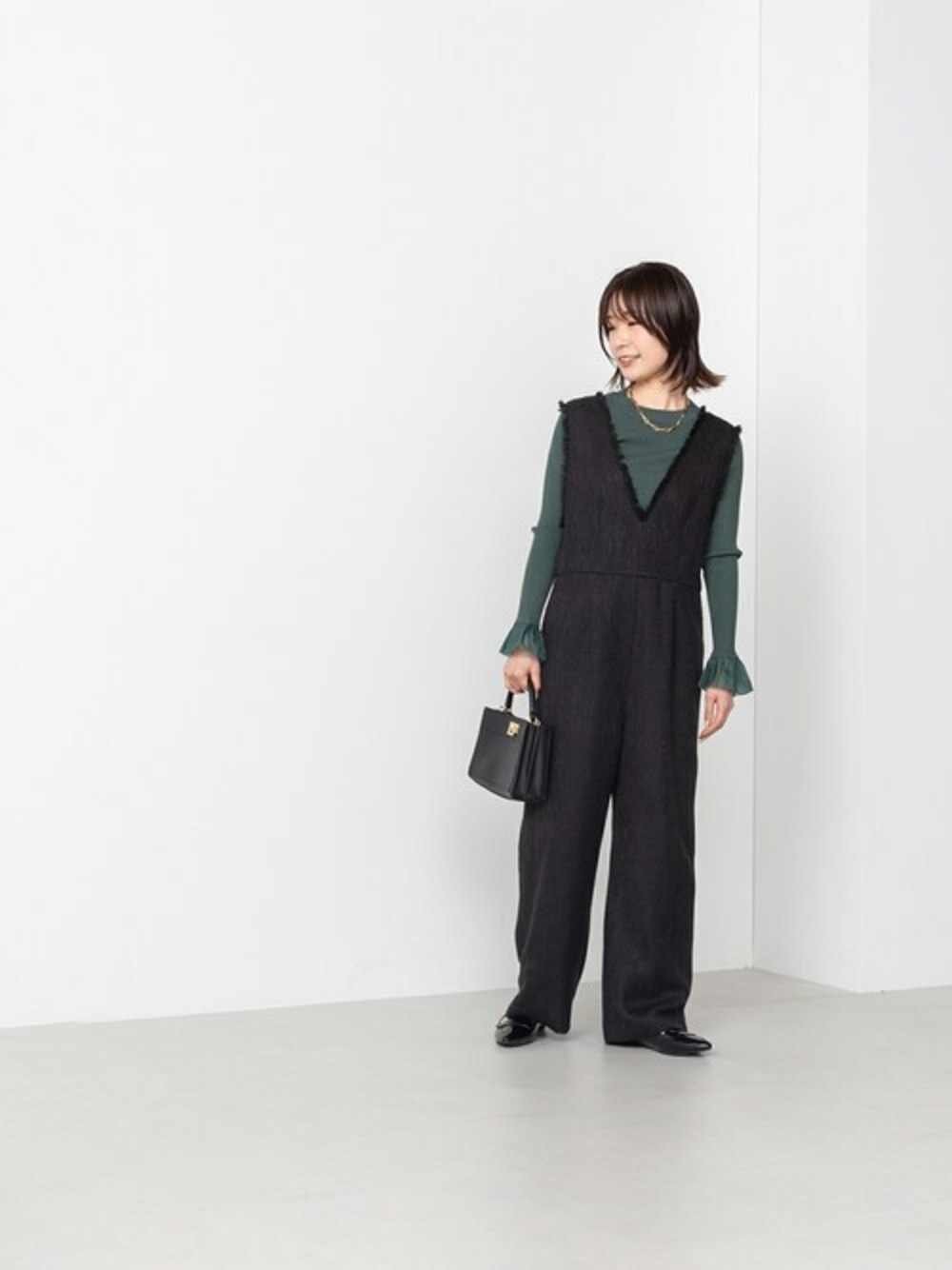 スラブ感のあるツイードがハンサムな印象のオールインワン。襟ぐりとアームホール部分にフリンジをあしらって華やかに仕上げました。