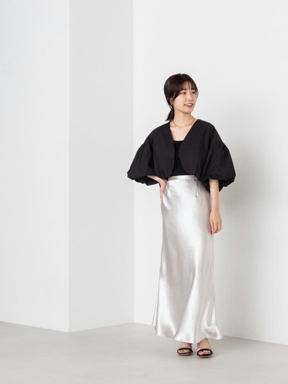 ブラック×シルバーのオトナコーデ♪トップスのボレロはふわっとしたボリュームスリーブが愛らしく、サテンスカートとの組み合わせでリュクスな雰囲気が演出されます。サテンスカートは汎用性が高く、きれいめなトップス以外にもスウェットを合わせるなどコーデのアレンジの幅が広いおすすめアイテムです。