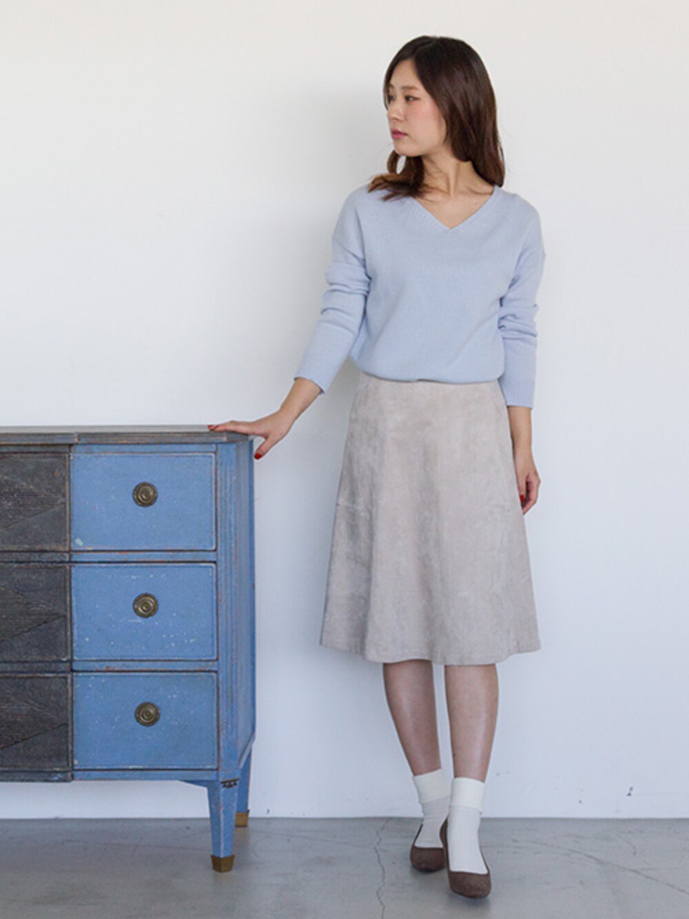 【本日発売!! NBB×JJコラボ商品】コーディネート♪ 今年らしいゆるVニット、スエードスカートは ふんわりカラーをチョイスしてフェミニンに。