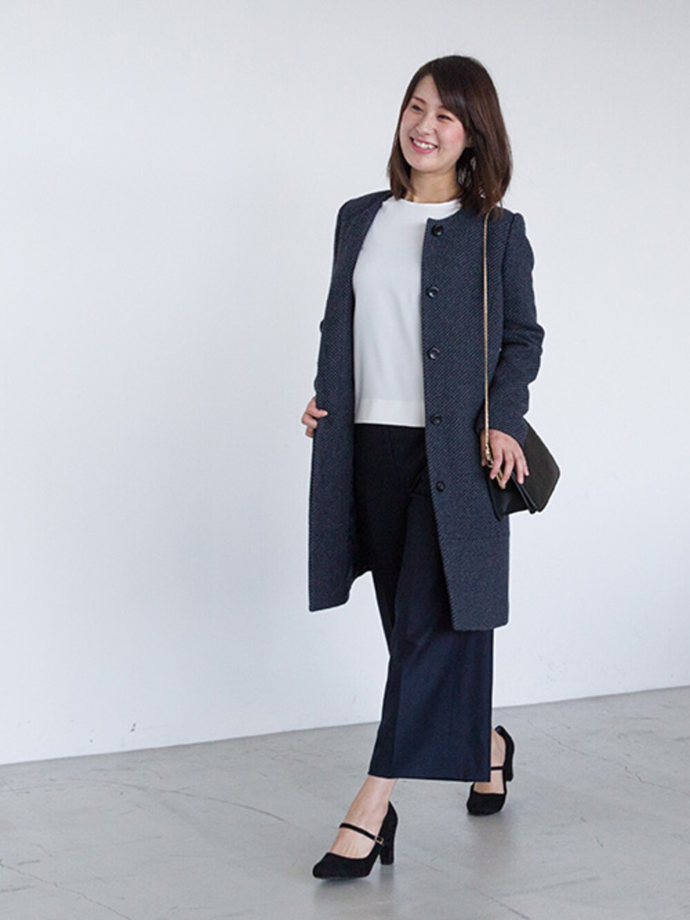 ワイドパンツの通勤コーデ。 ノーカラーコートはオンでもオフでも活躍するベストな1枚。
