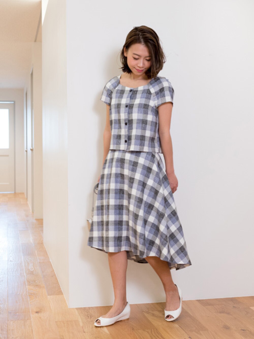 印象的なブロックチェックの短丈トップス&イレヘムラインのフレアスカート。セットであわせてワンピースライクに仕上げて。好感度の白小物で上品なおでかけスタイルに。